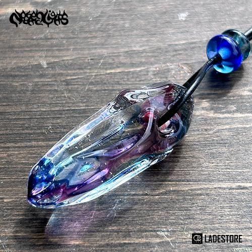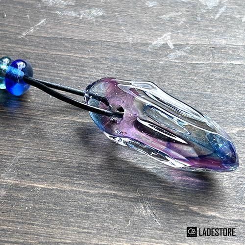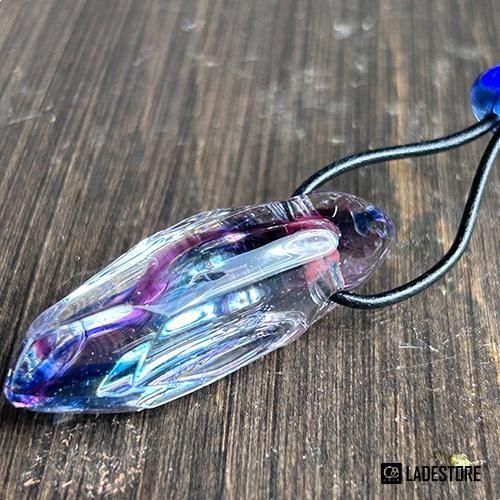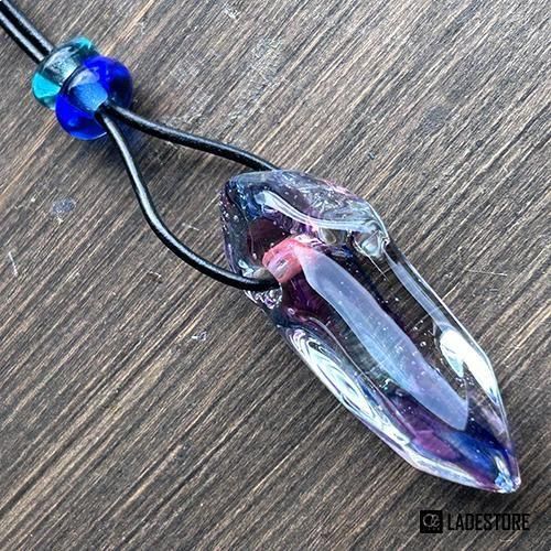 クリスタルシェイプのガラスの中に極めて芸術的な色つけによる色彩の交わりやグラデーションが美しいペンダントトップ。光を受けたガラスの色彩の変化や落とす色づいた影は晴れた日の太陽の元で見るとさらに美しく、見る角度で光の筋や表情を変え小さな不思議な世界観を有します。